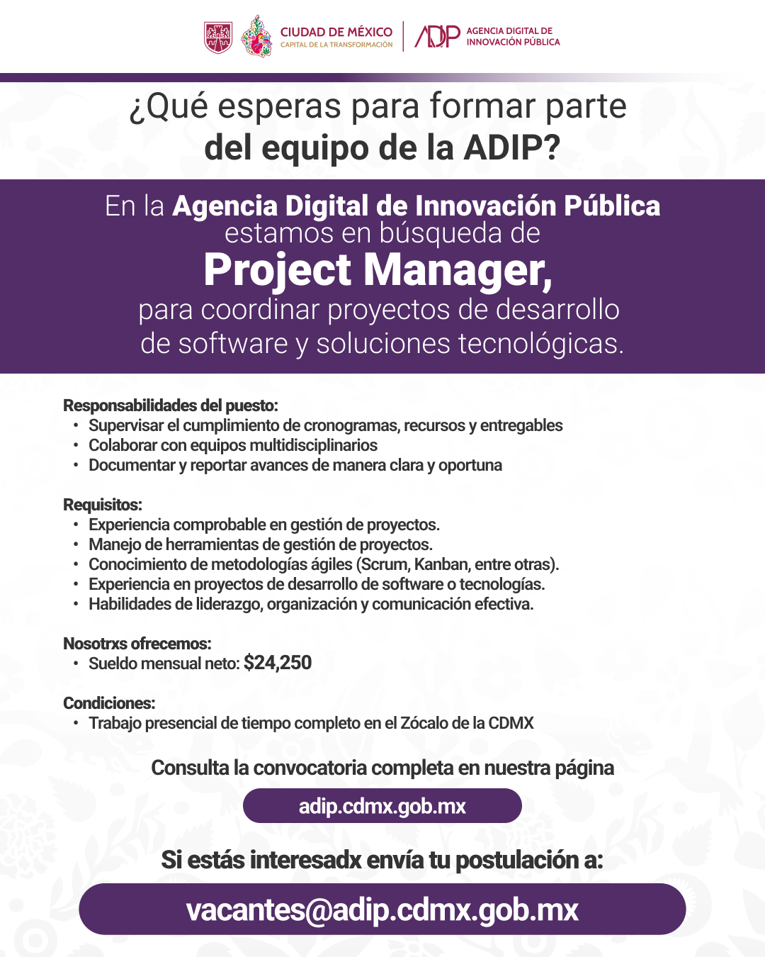 La Agencia Digital de Innovación Pública (ADIP) convoca a profesionistas interesadxs en integrarse a su equipo de trabajo como Project Manager, para coordinar proyectos de desarrollo de software y soluciones tecnológicas orientadas a mejorar los servicios públicos de la Ciudad de México.